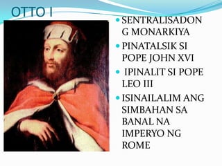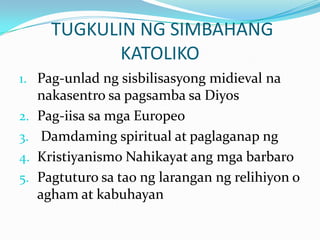 During the Middle Ages the most powerful institutions in Europe were the Roman Catholic Church and the Holy Roman Empire. Ang Simbahang Katolika sa Paglakas ng Europa Isa ang Simbahang Katolika sa mga malalakas na impluwensiya sa patuloy na pag-unlad ng kultura at kabihasnan sa Europa sa panahong Medieval. Pagbagsak ng Imperyong Roman Marami ang dahilan ng paglakas ng kapangyarihan ng Simbahang Katoliko at ng kapapahan.