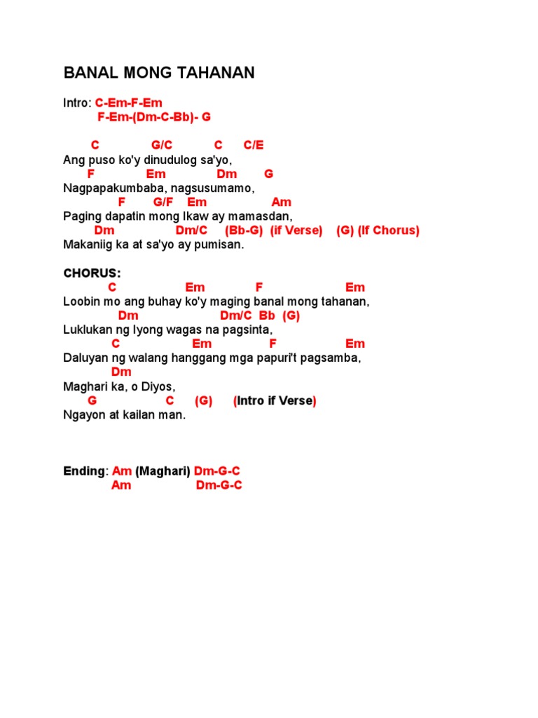 G D Fm Em D Ang puso koy dinudulog sayo C D Nagpapakumbaba nagsusumamo C D G Em. Translations of Banal Mong Tahanan English introvoyz041. Banal Mong Tahanan - Musikatha Lyrics and Chords Composer.