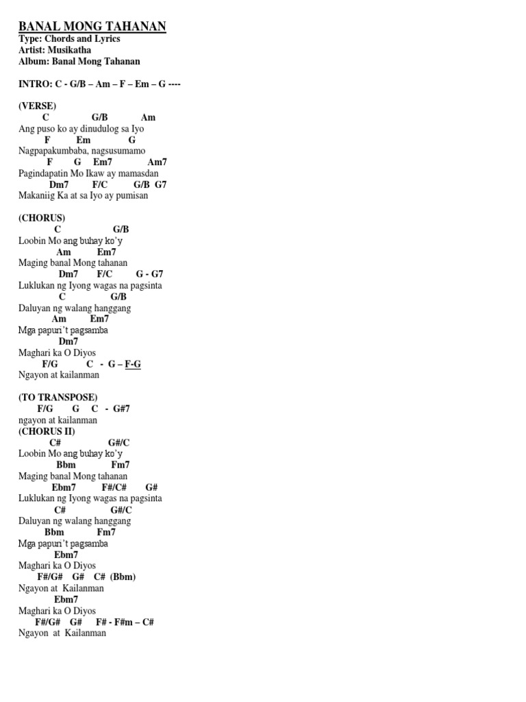View Banal Mong Tahanan by Musikatha - Chords and Lyricsdocx from EBOOKS 101 at Mindanao State University - General Santos. Author joseph22erap a 51. BANAL MONG TAHANANwmv chords by Unknown artist.